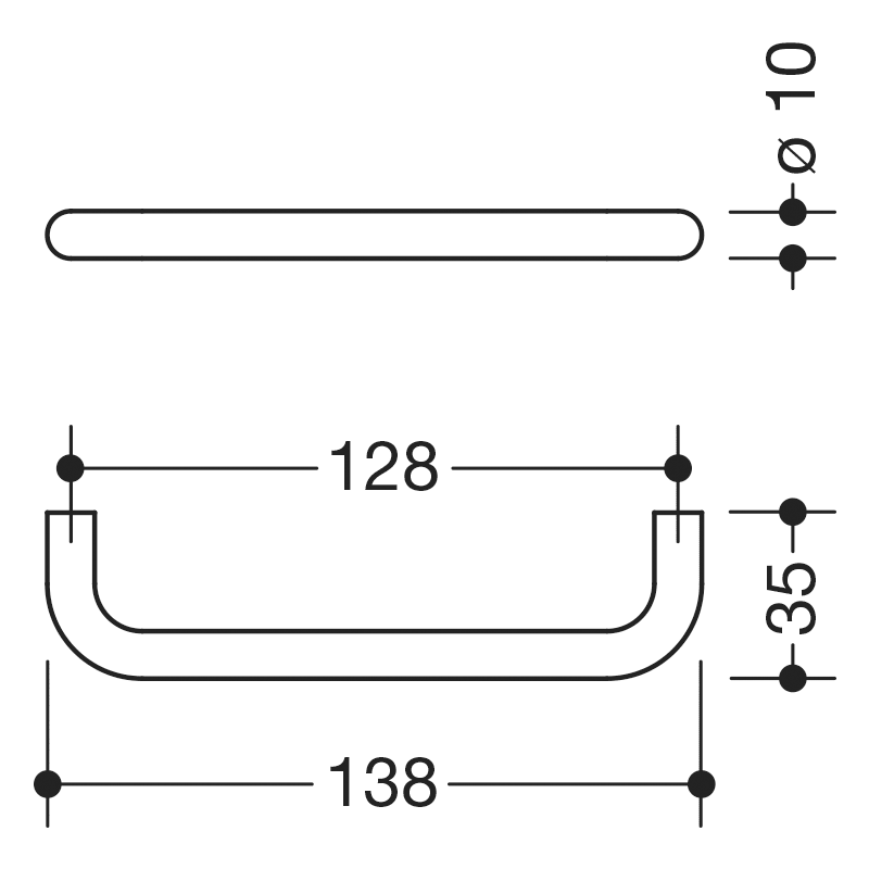 Griffchen aus Polyamid, Durchmesser 10 mm, Befestigungsabstand 128 mm, zur Verschraubung von der Rückseite. Lieferbar in den HEWI Farben.