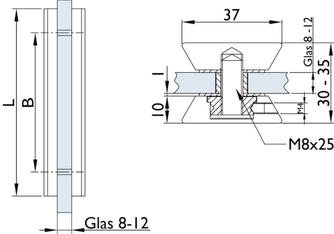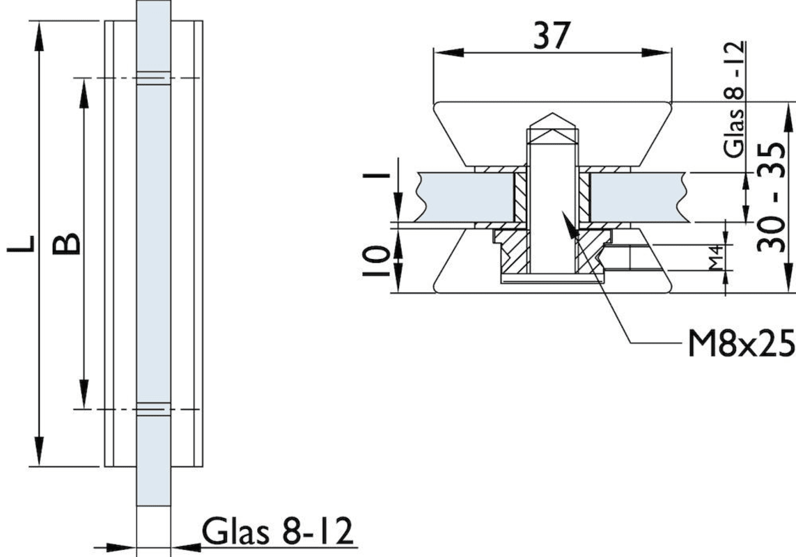 Gerade Griffleisten mit massiver Edelstahl Befestigungsaufnahme. Innensechskantschraubenschrauben mit Ausdrehsicherung. Paarweise, inkl. Befestigung für Glastüren. Mit M8/M6 Gewinde zur Verschraubung mit Stoßgriff 8000 20 oder 25 mm Stützen an Glas. Auch für Holztüren mit M8x50 mm SW4