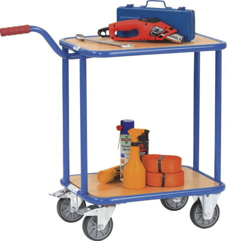 Griffroller, aus Stahlrohr • Stahlrohrkonstruktion: geschweißt, pulverbeschichtet in RAL 5007 brillantblau • Griff: anschraubbar • Mit 2 Holzplattformen • 2 Lenk- und 2 Bockrollen, TPE-Bereifung, Nab