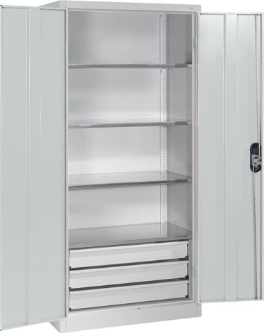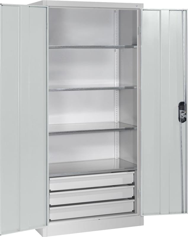 Großraum-Werkzeugschrank, mit 3 Schubladen unten • Material: Stahlblech mit hochwertiger Einbrennbeschichtung • Flügeltüren: mittig verstärkt, Aufhängung mit Drehbolzen, 110°-Öffnungswinkel • Verschluss: patentiertes, 3-riegeliges Griffschloss Ergo-Lock 4.0 mit 2 Schlüsseln • Einfach zu schließen – zudrücken, ohne dass die Schließstange den Schrankkorpus beschädigt • Einfach zu öffnen – auch mit Handschuh • Fachböden: 4, verzinkt, im 15-mm-Raster höhenverstellbar • Mit 3 Schubladen unten • 100-%-Vollauszug • Teleskopschienenführung • Traglast: 50 kg