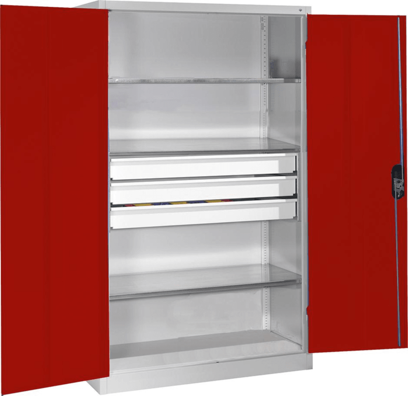 Großraum-Werkzeugschrank, mit 3 Schubladen mittig • Material: Stahlblech mit hochwertiger Einbrennbeschichtung • Auch in den Breiten 500 und 700 mm • Flügeltüren: mittig verstärkt, Aufhängung mit Dre