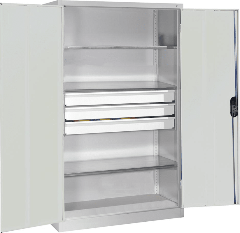 Großraum-Werkzeugschrank, mit 3 Schubladen mittig • Material: Stahlblech mit hochwertiger Einbrennbeschichtung • Auch in den Breiten 500 und 700 mm • Flügeltüren: mittig verstärkt, Aufhängung mit Dre
