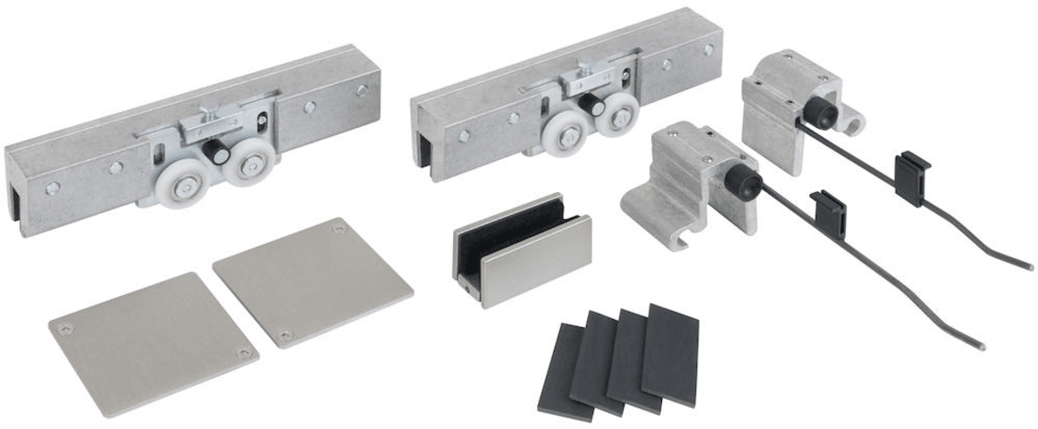 Grundkarton 9170 San Remo, ohne Laufprofil, 2 Laufwagen / 2 Endstopper / 2 Alu-Endkappen, 1 Bodenführung für Glas, Oberfl. F1 (Silberfarben eloxiert)