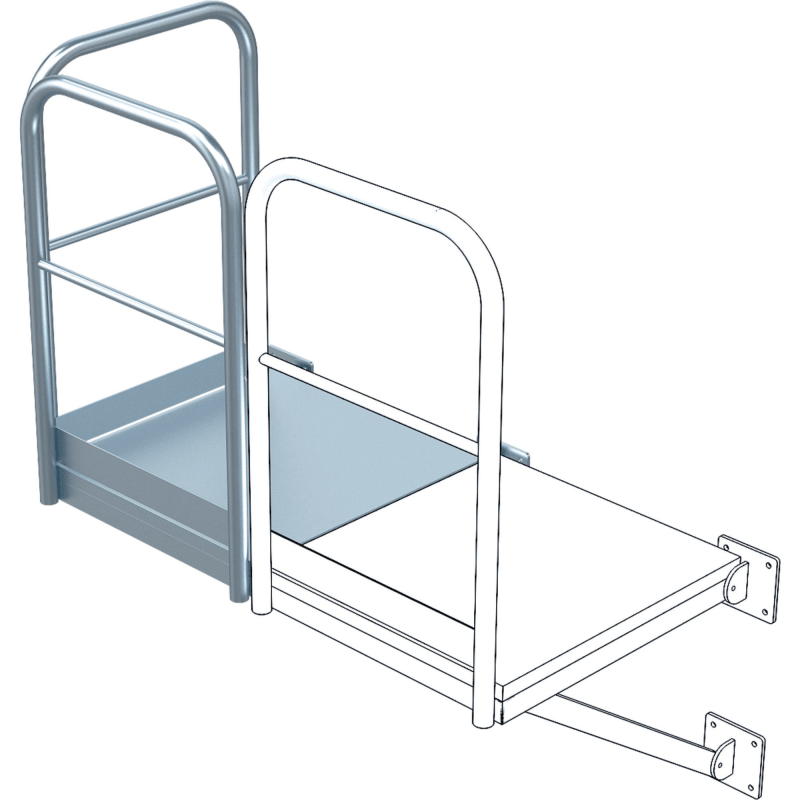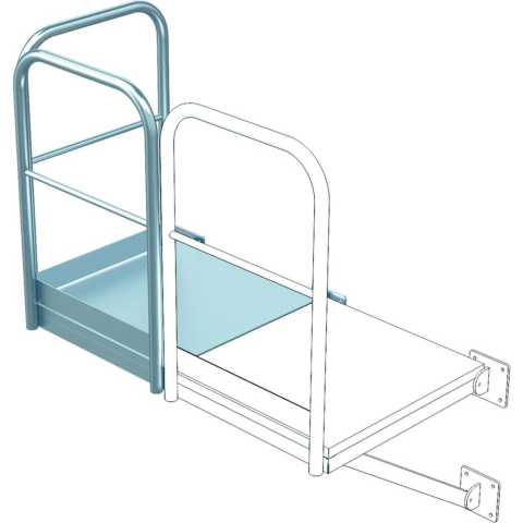 Grund-Podest für Steigleiter • Material: Stahl, verzinkt • Geländer: Längs-, Stirnseite • Flächenlast: 3,5 kN/m² • Einzellast: 1,5 kN/m² Lieferung: Gitterrost-Belag und 2 Anbaukonsolen.