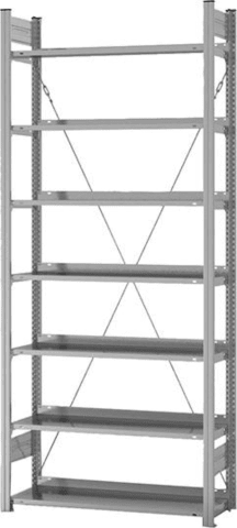 Büro-Steckregal, verzinkt • Oberfläche Böden/Rahmen: verzinkt • Fachlast: 60 kg • Raster Höhenverstellung: 25 mm Abstand • Aussteifung: Diagonalstreben • Bodenkante: 25 mm hoch • Schnelle Steckmontage: nachträglich beliebig erweiterbar • Einseitig nutzbar Planungshinweis: Grundregal: 810/1060 mm. Anbauregal: 760/1010 mm. Bodentiefe: 335 mm. Sicherheitshinweis: Regale mit einem Höhen-Tiefenverhältnis von größer als 5 : 1 müssen gegen Kippen gesichert werden (Wand- oder Deckenverankerung)