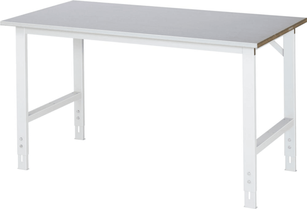 Arbeitstisch, Serie Tom, Stahlblechbelag-Platte • Stahlblechbelag-Platte: Oberseite mit einem 1,5 mm starken, verzinkten Stahlblechbelag, Feuerverzinkung nach EN10204, Vorderkante in U-Form • Stärke: 25 mm • Arbeitshöhe: von 760 bis 1080 mm einstellbar • Flächenlast: max. 500 kg • Stabiler Funktionsunterbau: Profil-Stahlrohr mit Fußelementen (60 x 30 mm), Querstreben (50 x 25 mm) und Aussteifungstraversen • Umweltfreundliche Pulverbeschichtung: RAL 7035 lichtgrau Lieferung: zerlegt, einfache Montage.