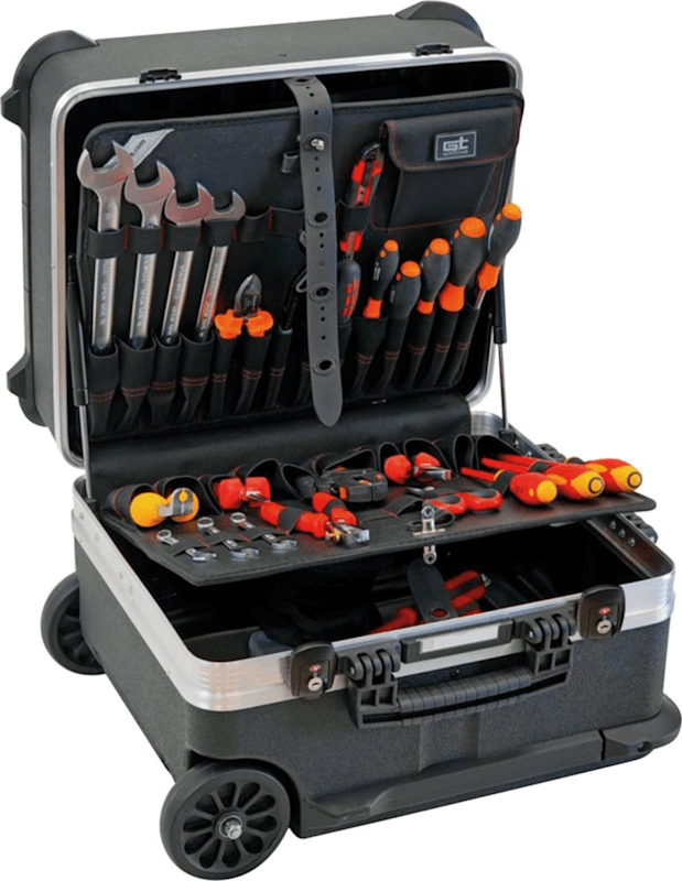 Werkzeugkoffer Turtle Wheels PTS• Kofferschale aus HDPE-Kunststoff • Mit Rollen und einrastendem Teleskopgriff • 2 Werkzeugtafeln mit Einstecktaschen • 1 Dokumentenfach • 3 Kleinteileboxen • TSA-