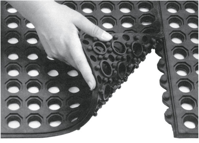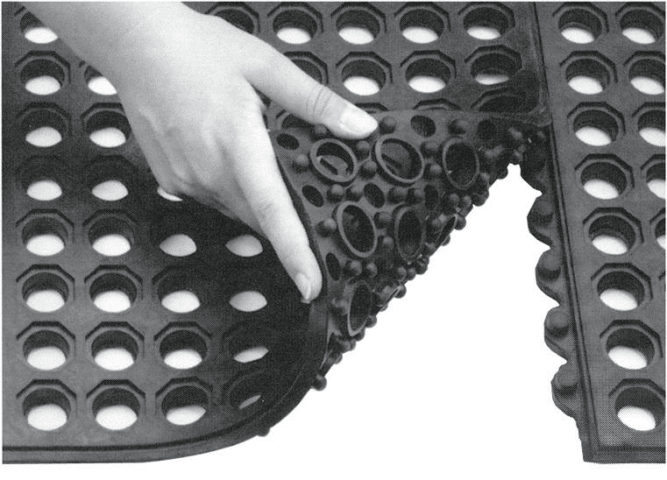 Gummi-Steckmatte SBR/NR• Mit abgeschrägten Kantenprofilen kombinierbar • Rutschfest und ermüdungsfrei • Stoß- und schalldämpfende Eigenschaften • Elastisch • Die Noppen unter der Matte gewährleist