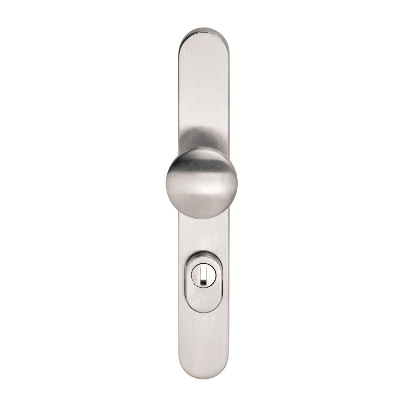 BKS Knopf B-75660; Material: Edelstahl; Befestigungsart: verdeckt verschraubt; Befestigungstechnik: mit Stütznocken; Abdeckung: auf Schutz-Langschild; Lagerung: wartungsfrei,fest; Form: oval; Widerstandsklasse: ES 3 (SK4); Norm: DIN EN 1906,DIN 18273,DIN 18257; Einsatzbereich: Feuerhemmend; Basis: Knopf; Schildstärke: 15 mm; Befestigungssystem: Stiftverbindung; Ausführung: mit Zylinderabdeckung,mit Rundknopf K1.0,mit Adapterplatte für Stangengriff B717x; Knopfform: rund; Zulassung: für Feuerschutz,für Rauchschutz; Eigenschaft: Knopf fest auf Schild; Benutzerklasse: Klasse 4; Knopfdurchmesser: 50 mm; Knopfhöhe: 57 mm; Oberfläche: matt gebürstet; Farbton: edelstahl; Türart: Rahmentüren; Türwerkstoff: Aluminium,Stahl; Knopfbefestigung: Wechselstift; Breite: 36 mm; Länge: 252 mm; Türstärke min.: 54 mm; Türstärke max.: 69 mm; DIN-Richtung: DIN Links-Rechts; Lochung: Profilzylinder gelocht; Entfernung: 72 mm; Vierkant: 9 mm