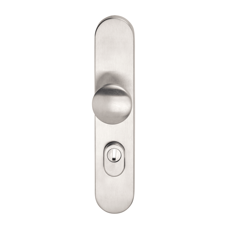 BKS Knopf B-75630; Material: Edelstahl; Befestigungsart: verdeckt verschraubt; Befestigungstechnik: mit Stütznocken; Abdeckung: auf Schutz-Langschild; Lagerung: fest,wartungsfrei; Form: oval; Widersta