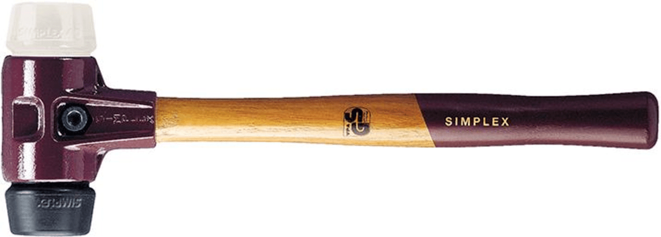 Schonhammer SIMPLEX Nr. 3028• Ein Schlagkopf aus Gummikomposition, mittelhart, dämpfend, verschleißarm • Ein Schlagkopf aus Nylon, hart, sehr verschleißfest, kein Absplittern (auch bei Minustemperat