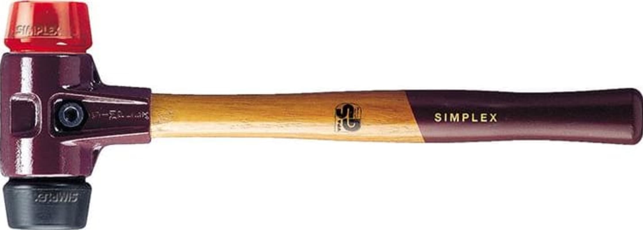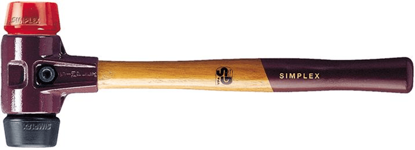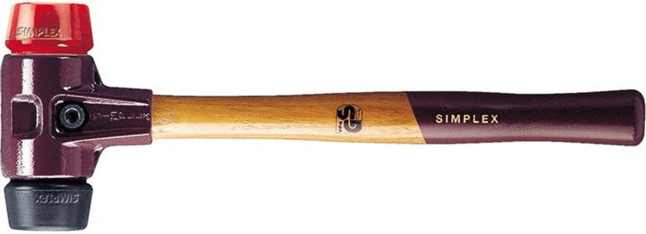Schonhammer SIMPLEX Nr. 3026• Ein Schlagkopf aus Gummikomposition, mittelhart, dämpfend, verschleißarm • Ein Schlagkopf aus Plastik, hart, öl- und fettbeständig • Gehäuse aus Temperguss, zweigeteilt