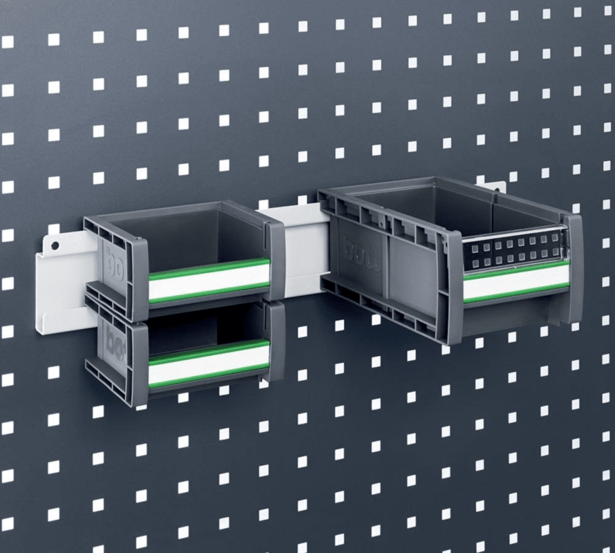 Halteschiene für Sichtlagerkasten • Zur Befestigung an perfo Lochplatten