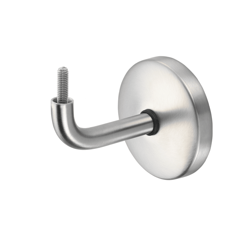 Handlaufstütze für 75 mm Wandabstand mit gewölbter Auflage. Mit drei versenkten Schraublöchern zum Anschrauben. Mit M6 Gewindestift und Abdeckkappe.