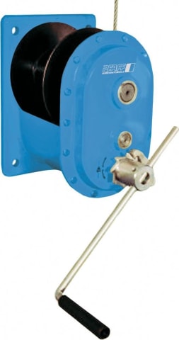 Handseilwinde mit Stirnrad-Getriebe • Bauweise: kompakt • Stahlblech: Windengehäuse und Seiltrommel • Getriebe: geschlossen, Schutz innen liegender Teile auch bei rauem Einsatz • Lager: Stirnräder wälzgelagert, Seiltrommel gleitgelagert • Befestigung: einfach und schnell an Wänden, Masten etc. • Kurbel: selbstarretierend, rückschlaggesichert, verstellbar für das schnelle Heben kleiner Lasten, geringstmögliche Anstrengung, rasche Aufwicklung des Seils • Lastdruck-Bremse: feinfühliges Heben, Senken der Last, verhindert ungewolltes Lösen der Bremse bei schwingender Belastung • Temperaturbereich: –20 °C bis +40 °C • Seil gemäß DIN 3060 FE-znk 1770sZ-spa Hinweis: Auf Anfrage korrosionsgeschützte Ausführung.