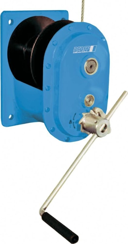Handseilwinde mit Stirnrad-Getriebe • Bauweise: kompakt • Stahlblech: Windengehäuse und Seiltrommel • Getriebe: geschlossen, Schutz innen liegender Teile auch bei rauem Einsatz • Lager: Stirnräder wä
