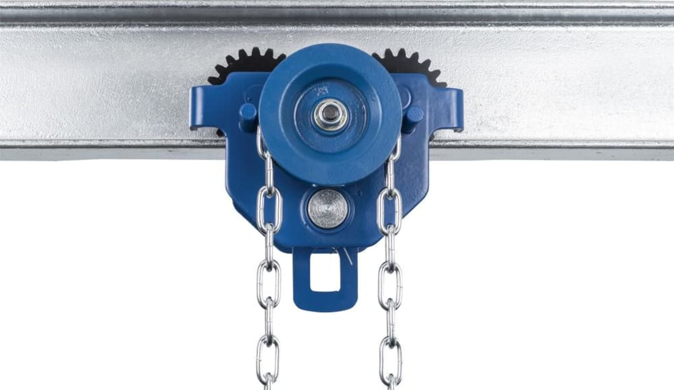 Haspelkettenlaufkatze Modell GTM • Ausführung: durch Ziehen an der endlosen Handkette wird das Transportgut nach rechts oder links bewegt. Die verzinkte Handkette ist zum Schutz des Bedieners • Stabi