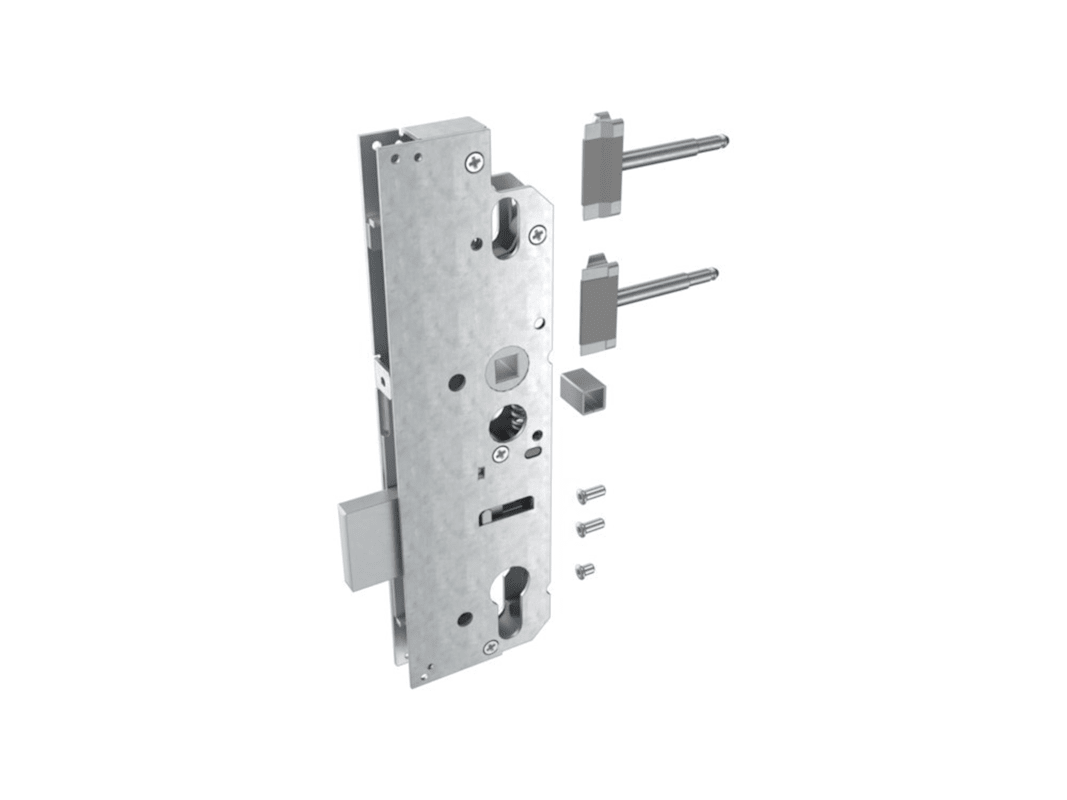 HAUPTSCHLOSS-SET BESTEHEND AUS: HAUPTSCHLOSS 3050 PZW 45-92-10 MIT LOSER ANGESCHRAEGTER + ABGESETZTER SOFTLOCK-FALLE, REDUZIERHUELSE 10 AUF 8 MM VIERKANT, 3 BEFESTIGUNGSSCHRAUBEN FUER HAUPTSCHLOSS