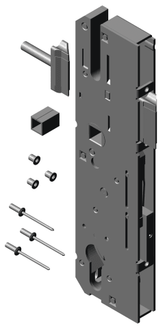 HAUPTSCHLOSS-SET BESTEHEND AUS: HAUPTSCHLOSS-TYP V, PZW, 55/72/10 MM, MIT ANGESCHRAEGTER SOFTLOCKFALLE, LOSER 2 MM ABGESETZTER SOFTLOCKFALLE, REDUZIERHUELSE 10 AUF 8 MM VIERKANT, 3 BEFESTIGUNGSSCHRAUB