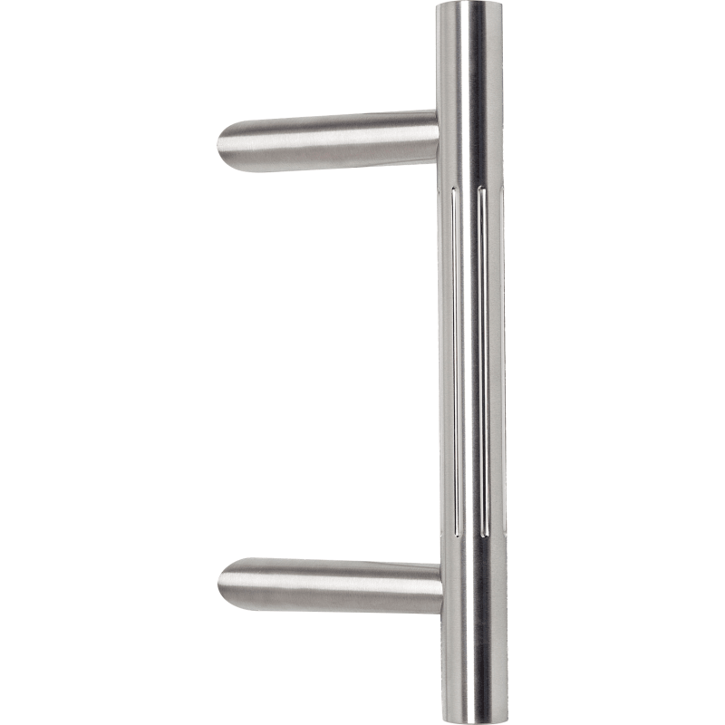 Stoßgriff aus Edelstahlrohr, mit schrägen Stützen, mit polierten senkrechten Rillen im Griff.