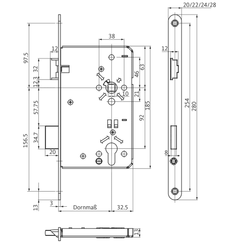 BKS Einsteckschloss B-00240; Produkttyp: Einsteckschloss; Produkttyp (Hersteller): Haustürschloss; Ausführung: mechanisch; Verriegelung: manuell; Entriegelung: manuell; Drückernuss: einteilig; Stulpform: Flachstulp; Material Stulp: Stahl; Schlosskasten: geschlossen; Schlosskastenhöhe: 185 mm; Schlosskastenstärke: 13 mm; Türart: Vollblatt; Türflügelanzahl: einflügelig; Türwerkstoff: Holz,Stahl; Einsatzbereich: Gangflügel; Dornmaß: 55 mm; Hinterdornmaß: 32,5 mm; Drückernussvierkant: 10 mm; Entfernung: 92 mm; Lochung: Profilzylinder gelocht; DIN-Richtung: DIN Links; Stulpausführung: rund,Falz; Stulpbreite: 22 mm; Stulplänge: 280 mm; Stulpstärke: 3 mm; Farbton Stulp: nickelsilber; Oberfläche Stulp: lackiert; Material Falle: Zinkdruckguss; Schlossriegel: 2 tourig; Riegelausschluss: 20 mm; Einbautiefe Schlosskasten: 84,5 mm; Wechsel: mit Wechsel