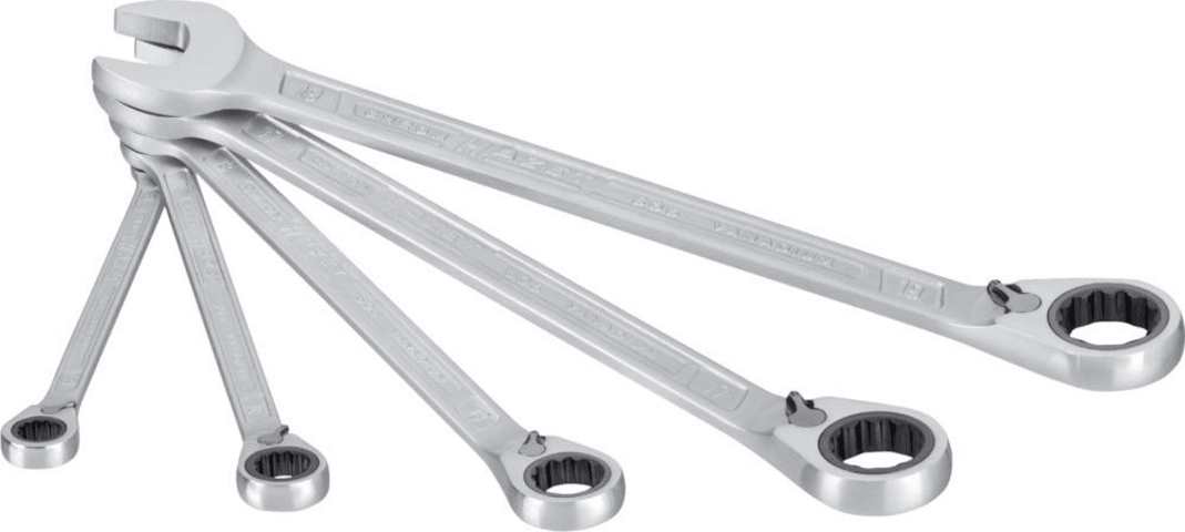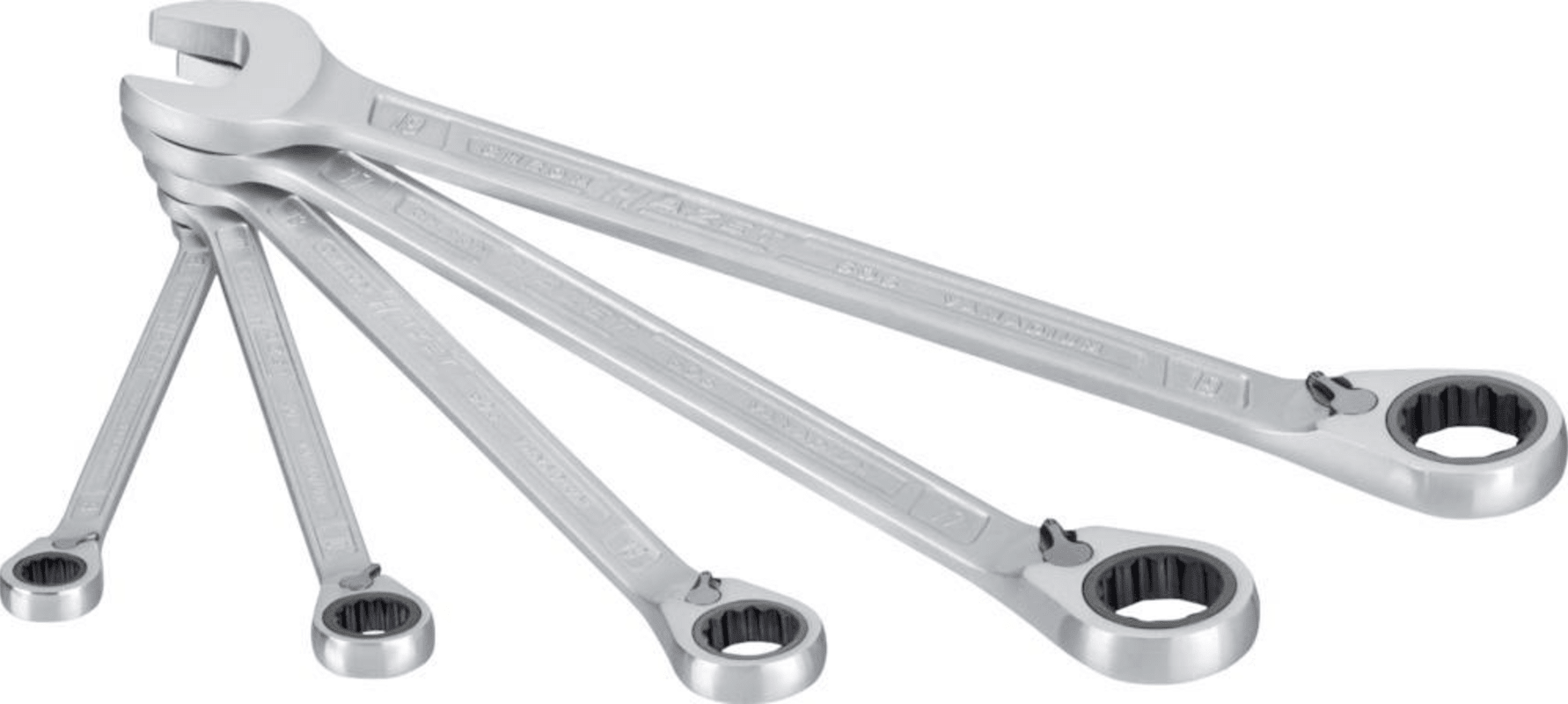 Maul-Ringratschen-Schlüssel-Satz, Nr. 606/5• Matt verchromt • Chrom-Vanadium-Stahl • Maulstellung 15° abgewinkelt • Ratschenstellung 13° abgewinkelt • Feinverzahnt, 72 Zähne • Rückschwenkwinkel 5