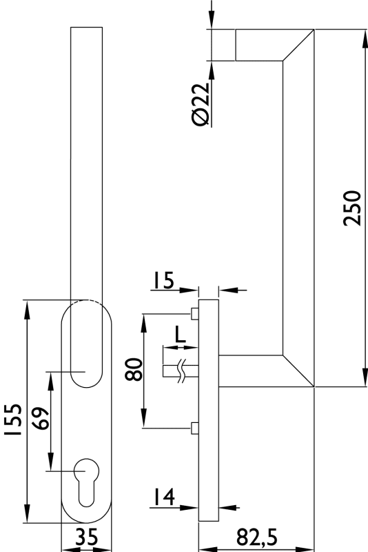 Hebe-Schiebetürgriff 1808 BASIC 08, 180° Rasterung / mit PZ Lochung, verdeckte Verschraubung, mit Vierkantst. 10 x 95 mm u. Schrauben M6 x 80 mm, Oberfl. 60 (Edelstahl matt)