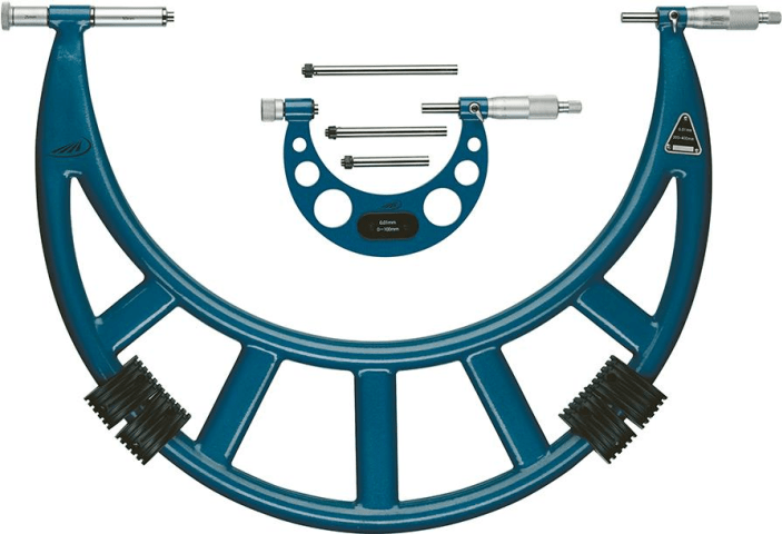 Bügelmessschraube mit wechselbaren Einsätzen• Bügel lackiert • Ableseteile matt verchromt • Feststellung durch Klemmhebel • Messflächen HM-bestückt • Handwärmeisolierung • Messkraftregelung durch