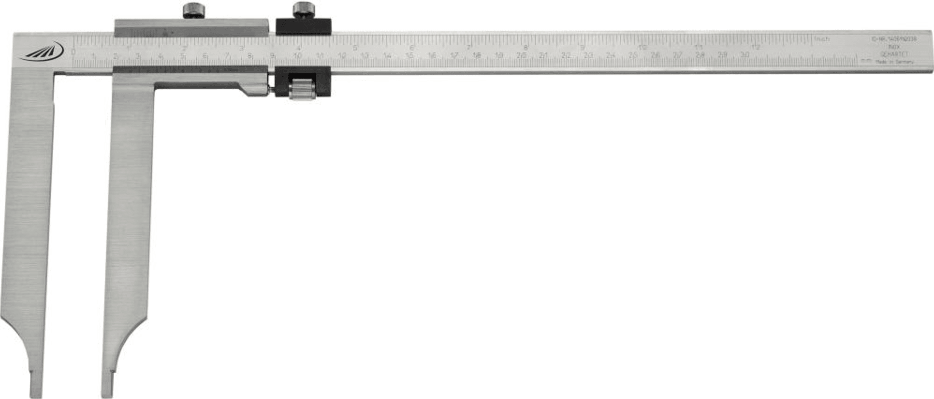 Werkstattmessschieber mit langen Messschenkeln, ohne Spitzen, mit Feinstellung• Werksnorm • Stahl, rostfrei • Nonius und Skala matt verchromt • Mit Feststellschraube • 2-fach-Messung (Innen- und A