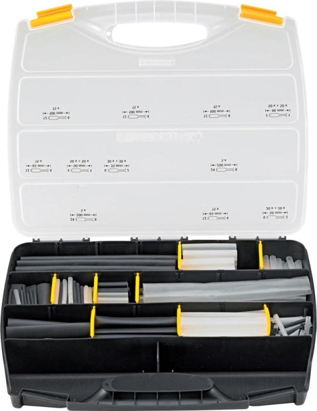 Schrumpfschlauch-Sortiment ShrinKit 321-A• Schwarz, selbstlöschend • Transparent, nicht selbstlöschend • Schläuche mit heißschmelzendem Innenkleber versehen • Dadurch vor Feuchtigkeit geschüzt und