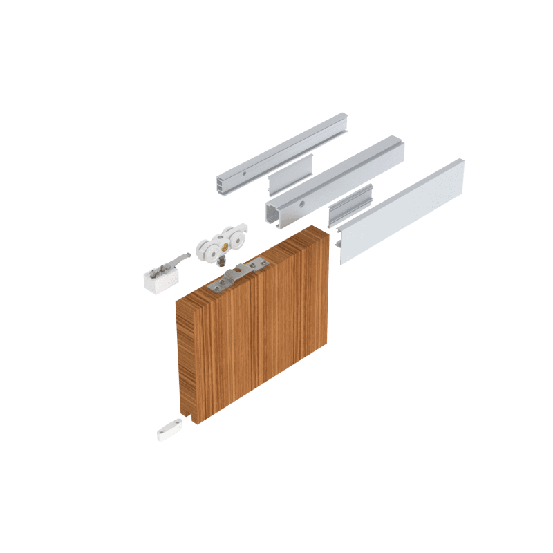 Schiebetürsystem für Wandmontage mit 15 mm Abstandsprofilund Verblendungfür Innenschiebetüren aus HolzRollapparate: höhenverstellbar im eingebauten Zustand, mit belastbarer Pendeleinlage für eine lang