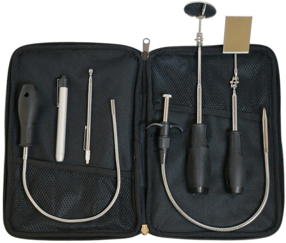 Inspektionswerkzeug-SetLieferung: Im Etui. Inhalt: 1 Krallengreifer mit Krallenöffnung 15 mm, Länge 500 mm 1 Magnetheber mit flexibler Welle, Länge 440 mm 1 Teleskop-Suchspiegel, rund, Ø 50 mm, L