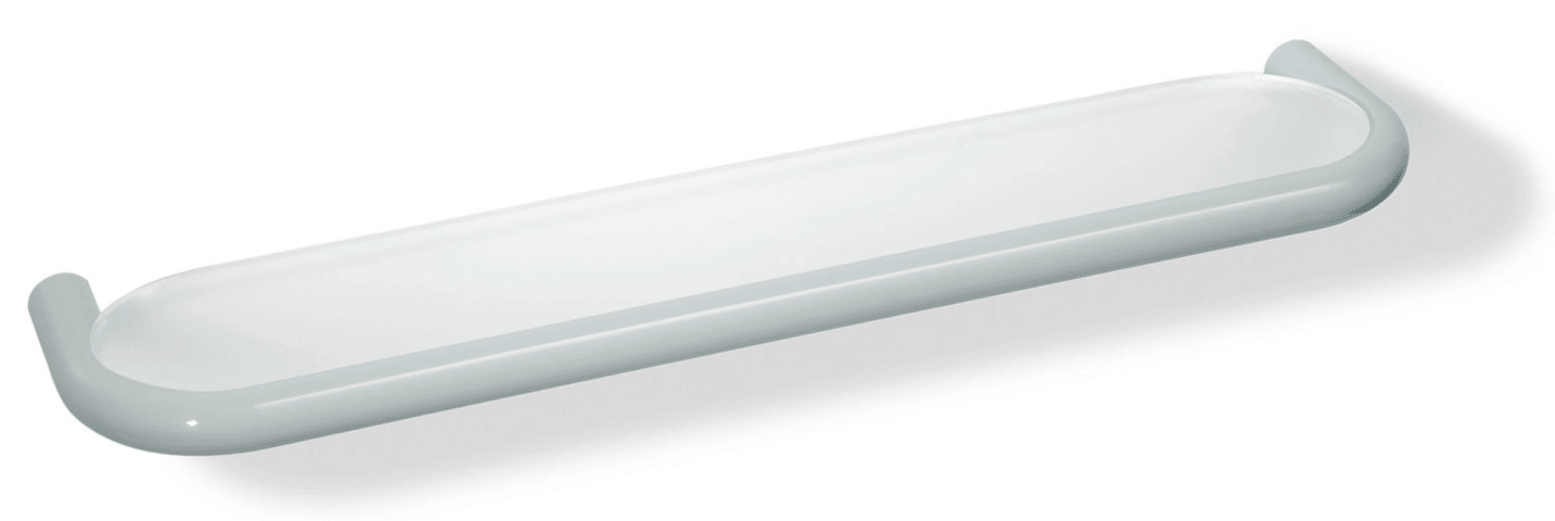 HEWI Ablage mit Glasplatte der Serie 477mit umlaufendem Rand und fest eingespannter matt-weißer Glasplatte, diebstahlgeschützt durch Verriegelung, 600 mm breit, 28 mm hoch und 140 mm tief, Glasplatte