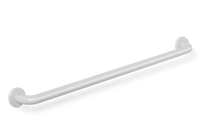 an den Enden im rechten Winkel abgebogene Stange mit Befestigungsrosetten, mit korrosionsgeschützter Stahleinlage, 1000 mm breit (Achsmaß), 90 mm tief und 33 mm im Durchmesser, Rosettendurchmesser 70 mm, aus hochwertigem Polyamid nach HEWI Farbtabelle, inklusive korrosionsfreiem HEWI Befestigungsmaterial.