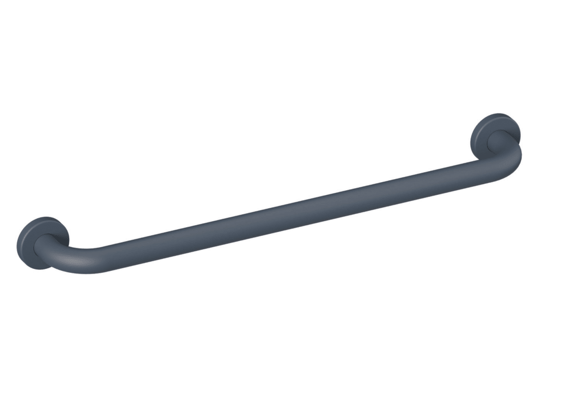 an den Enden im rechten Winkel abgebogene Stange mit Befestigungsrosetten, Befestigung mit Rosetten, 570 mm breit (Achsmaß), 85 mm tief und 28 mm im Durchmesser, Rosettendurchmesser 60 mm, aus hochwertigem, mattem Polyamid in den HEWI Farben 99 (Reinweiß), 98 (Signalweiß), 97 (Lichtgrau), 95 (Felsgrau) und 92 (Anthrazitgrau), inklusive korrosionsfreiem HEWI Befestigungsmaterial.