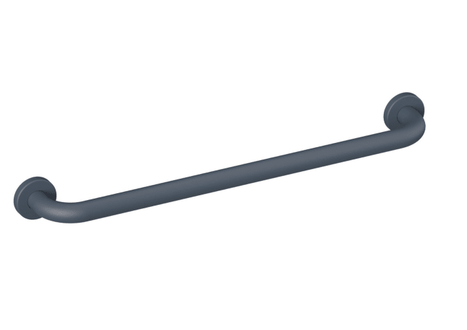 An den Enden im rechten Winkel abgebogene Stange mit Befestigungsrosette, Befestigung mit Rosetten, 457 mm breit (Achsmaß), 85 mm tief und 28 mm im Durchmesser, Rosettendurchmesser 60 mm, aus hochwertigem, mattem Polyamid in den HEWI Farben 99 (Reinweiß), 98 (Signalweiß), 97 (Lichtgrau), 95 (Felsgrau) und 92 (Anthrazitgrau), inklusive korrosionsfreiem HEWI Befestigungsmaterial.