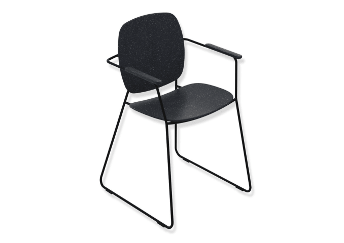 Gestell schwarz tiefmatt pulverbeschichtet, Sitzfläche, Rückenlehne und Armpads aus hochwertigem PIR Kunststoff (Post-Industrial-Recycling), Höhe 856 mm, Breite 545 mm, Sitzhöhe 479 mm, Sitzfläche 475 mm breit, belastbar bis 150 kg, Eigengewicht 9,9 kg.