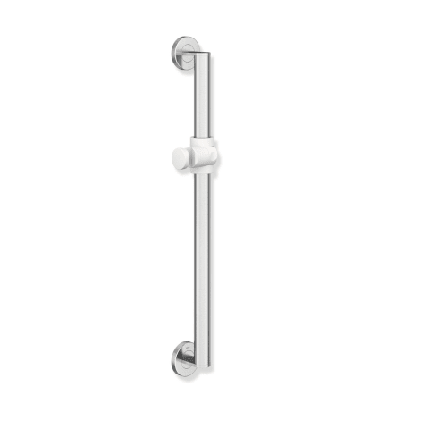 senkrechte Stange mit zur Wand ausgeführten Stützen, Befestigungsrosetten und Brausehalter, Achsmaß 610 mm, 70 mm tief, Stangendurchmesser 32 mm, Rohrstärke 2 m, Rosettendurchmesser 70 mm, belastbar bis 150 kg, aus Edelstahl, matt geschliffen, Brausehalter aus hochwertigem matten Polyamid in den HEWI Farben 98 (Signalweiß) und 92 (Anthrazitgrau), geeignet für Handbrausen verschiedener Hersteller, inklusive korrosionsfreiem und geprüftem HEWI Befestigungsmaterial zur Wandmontage. Erfüllt die Anforderungen nach 2010 ADA Standards und ICC/ANSI A117.1-2017.