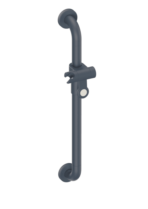 Stangensystem mit Brausehalter, mit korrosionsgeschützter Stahleinlage, Befestigung mit Rosetten, 800 mm hoch (Achsmaß), 90 mm tief und 33 mm im Durchmesser, Rosetten 70 mm im Durchmesser, aus hochwertigem, mattem Polyamid in den HEWI Farben 99 (Reinweiß), 98 (Signalweiß), 97 (Lichtgrau), 95 (Felsgrau) und 92 (Anthrazitgrau), Funktionsbereich des Brausehalters in hochwertigem, glänzendem Polyamid, inklusive korrosionsfreiem HEWI Befestigungsmaterial.