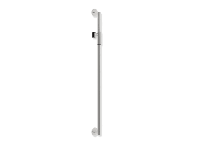 senkrechte Stange mit zur Wand ausgeführten Stützen, Befestigungsrosetten und Brausehalter, Achsmaß 1100 mm, 88 mm tief, Stangendurchmesser 32 mm, Rohrstärke 2 mm, Rosettendurchmesser 70 mm, aus hochwertigem Edelstahl, verchromt, Brausehalter aus hochwertigem matten Polyamid in den HEWI Farben 98 (Signalweiß) und 92 (Anthrazitgrau), geeignet für Handbrausen verschiedener Hersteller, inklusive korrosionsfreiem und geprüftem HEWI Befestigungsmaterial zur Wandmontage.