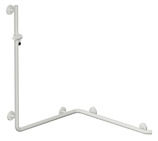senkrecht und waagerecht angeordnete, im rechten Winkel verbundene Stangen mit Brausehalter, aus hochwertigem Polyamid in den HEWI Farben 98 (Signalweiß) oder 99 (Reinweiß), Brausehalter mit schwarz gekennzeichnetem Griffbereich, mit durchgehendem, korrosionsgeschütztem Stahlkern, senkrechte Länge 1250 mm, waagerechte Längen je 762 mm, 90 mm tief, Stangendurchmesser 33 mm, geeignet für Handbrausen verschiedener Hersteller, links- und rechtsseitig montierbar, inklusive korrosionsfreiem HEWI Befestigungsmaterial.