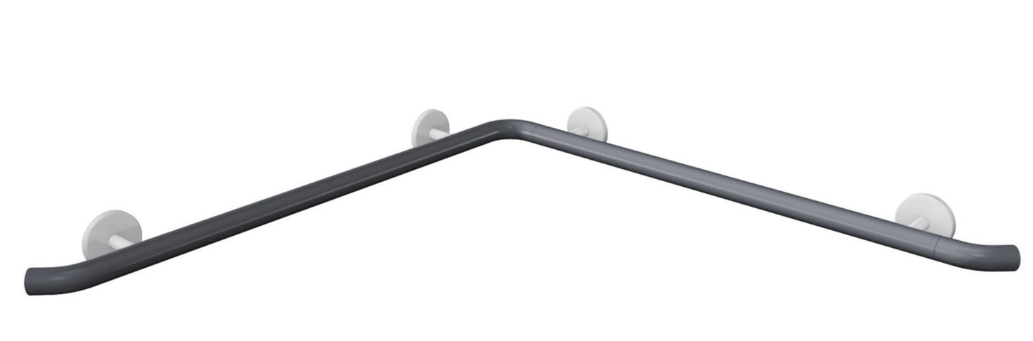 waagerecht angeordnete, im rechten Winkel verbundene Stangen, aus hochwertigem Polyamid, Stangen nach HEWI Farbtabelle, Brausehalter, Stützen und Rosetten in der HEWI Farbe 99 (Reinweiß), mit durchgehendem, korrosionsgeschütztem Stahlkern, waagerechte Längen 762 mm und 762 mm, 90 mm tief, Stangendurchmesser 33 mm, inklusive korrosionsfreiem HEWI Befestigungsmaterial.