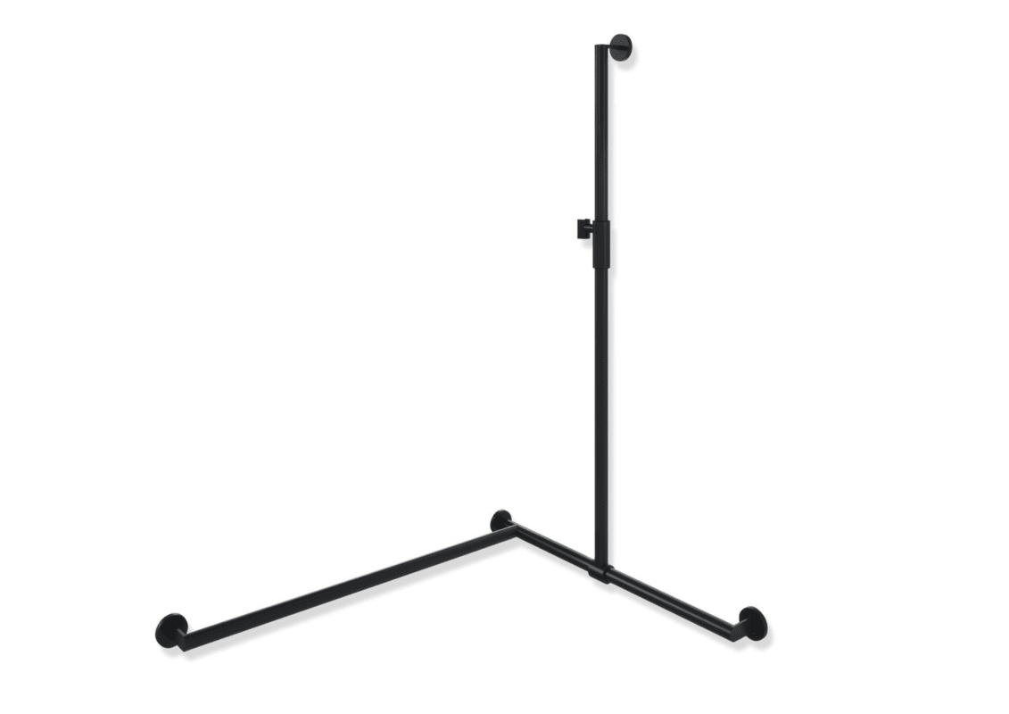 Edelstahl, pulverbeschichtet, mit stufenlos verstellbarem, magnetischem Brausehalter aus Edelstahl in Farbe der Brausestange, senkrechte Länge 1250 mm, waagerechte Längen (Eckmontage) 765 mm und 965 mm, Durchmesser 32 mm, Ausführung links, erfüllt die Anforderungen nach ÖNORM B1600/1601.