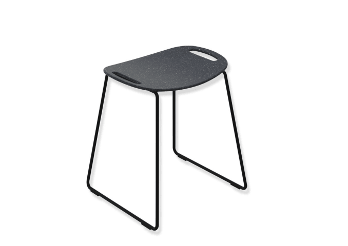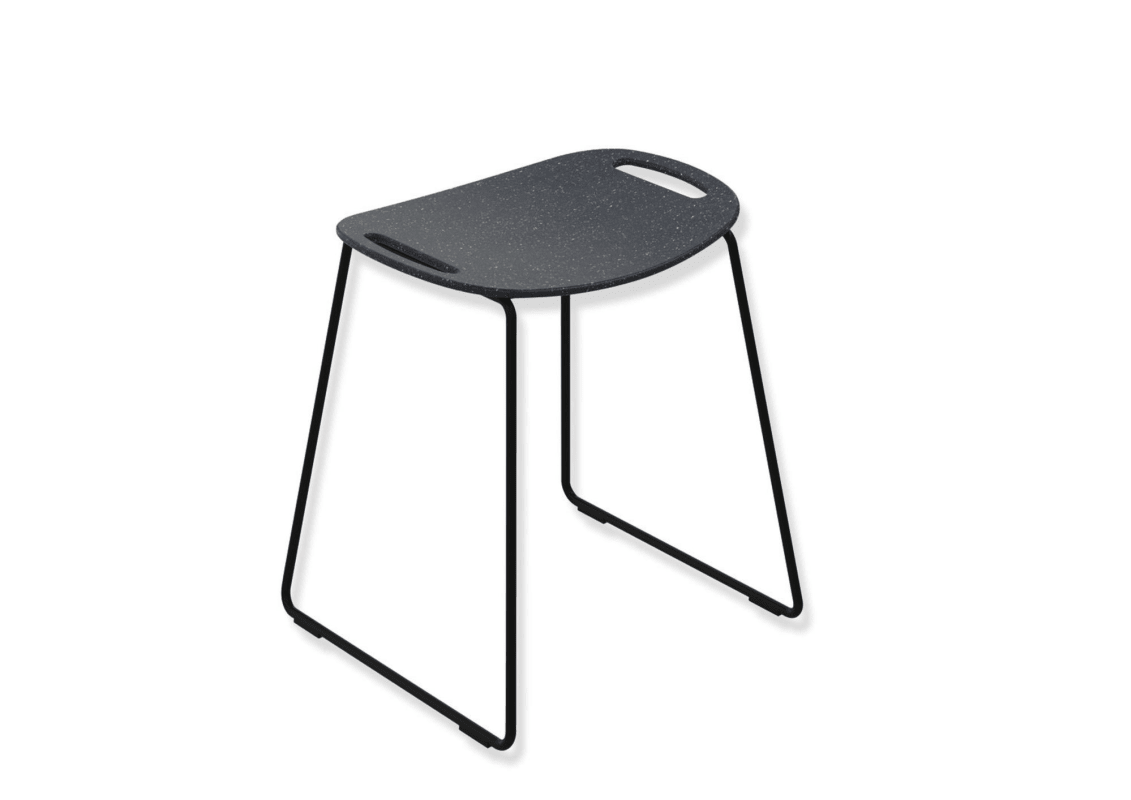 Gestell schwarz tiefmatt pulverbeschichtet, Sitzfläche aus hochwertigem PIR Kunststoff (Post-Industrial-Recycling), Höhe 507 mm, Breite 489 mm, Sitzhöhe 482 mm, Sitzfläche 462 mm breit, belastbar bis 150 kg, Eigengewicht 5,2 kg.