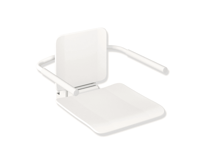 Verstärkung der Sitzfläche und Einhängevorrichtung aus Aluminium, pulverbeschichtet, rutschhemmende, strukturierte Sitzfläche und Rückenlehne aus mattem Kunststoff in Farbe der Einhängevorrichtung, Sitzfläche 450 mm breit, 450 mm tief, zum Einhängen in HEWI Duschhandläufe und Haltegriffe mit Durchmesser 30, 32 und 33 mm, belastbar bis 150 kg, erfüllt die Anforderungen nach SIA 500.