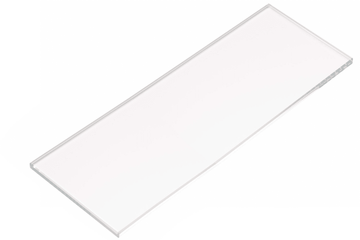 Die Glasplatte aus Klarglas ist zum Einschieben in Glasplattenhalter gedacht und hat geschliffene Kanten. Sie ist 557 mm breit, 8 mm stark und 116 mm tief.