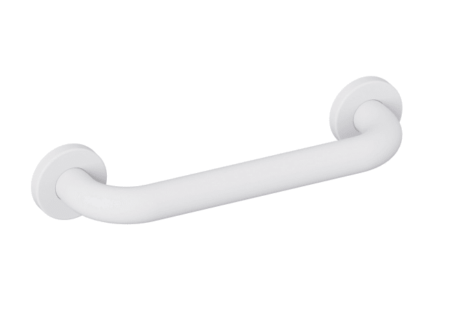 An den Enden im rechten Winkel abgebogene Stange mit Befestigungsrosetten, zur Montage an der Wand mit Rosetten, 300 mm breit (Achsmaß), 90 mm tief und 33 mm im Durchmesser, Rosettendurchmesser 70 mm, aus hochwertigem, mattem Polyamid in den HEWI Farben 99 (Reinweiß), 98 (Signalweiß), 97 (Lichtgrau), 95 (Felsgrau) und 92 (Anthrazitgrau), inklusive korrosionsfreiem HEWI Befestigungsmaterial.