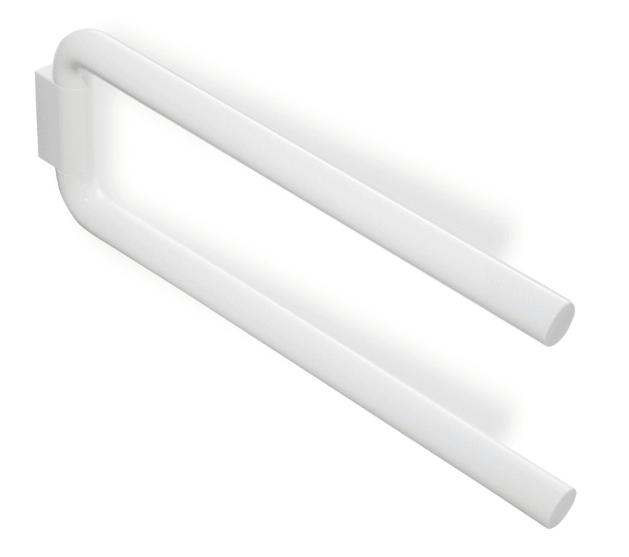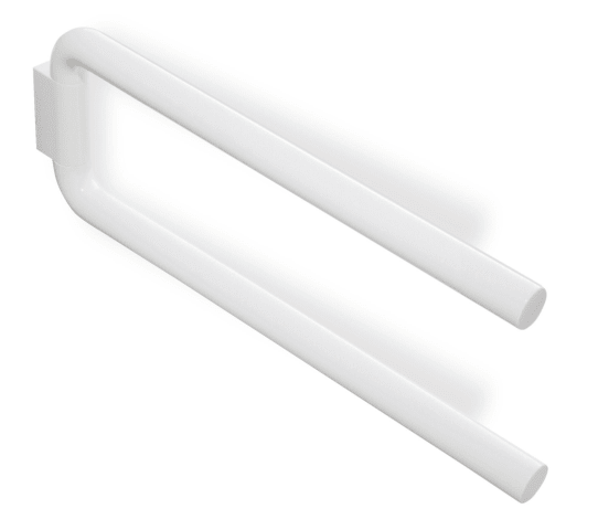 Handtuchhalter mit zwei übereinander angeordneten, zylindrischen Haltearmen, 446 mm lang und 160 mm hoch, Durchmesser der Haltearme 28 mm, aus hochwertigem Polyamid nach HEWI Farbtabelle, inklusive korrosionsfreiem HEWI Befestigungsmaterial.