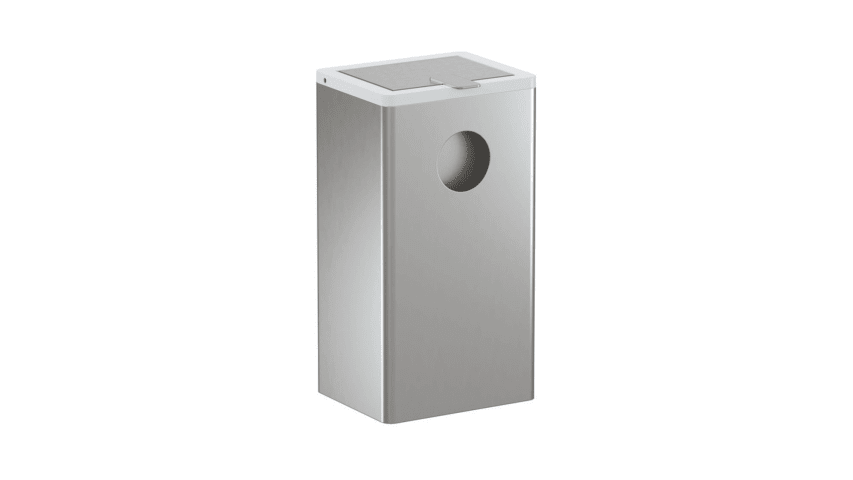 Ein kubischer Grundkörper aus hochwertigem Edelstahl mit eingerücktem Wandsockel. Fassungsvermögen ca. 6 l, unsichtbare, mit integrierter Aufnahme für handelsübliche Hygienebeutel aus Kunststoff (max. Packungsgröße L 130 x B 90 x H 20 mm), 160 mm breit, 300 mm hoch und 140 mm tief, Behälter und Deckel aus hochwertigem Edelstahl, Oberfläche matt geschliffen, Einwurföffnung aus hochwertigem Polyamid in den HEWI Farben 90 (Tiefschwarz), 92 (Anthrazitgrau), 98 (Signalweiß) oder 99 (Reinweiß), inklusive korrosionsfreiem Befestigungsmaterial.