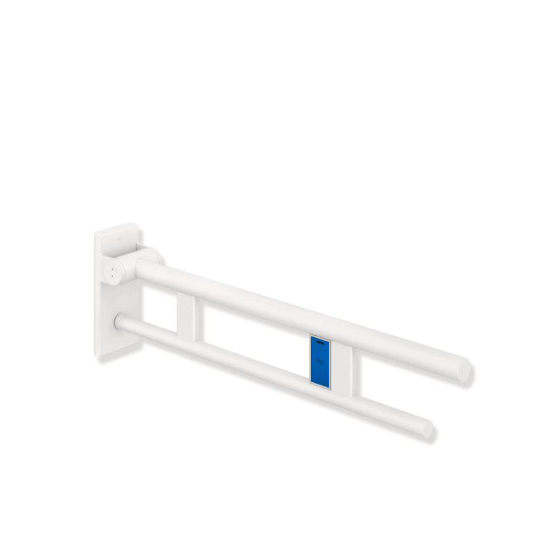 zwei parallele, übereinander angeordnete runde Griffebenen, aus hochw. Edelstahl, pulverbesch. i. d. HEWI Farben DX (Weiß tiefmatt), DC (Schwarz tiefmatt) und SC (Dunkelgrau Perlglimmer tiefmatt), m. Funk-Spülauslösung, Ausf. rechts, passend zu Funk WC-Spülsystemen von Geberit, Mepa, Viega, Sanit, Friatec, TECE und Grohe, mob. einsetzb., z. Nachr. auf Montageplatte 900.50.00160, (separat zu bestellen), blaue Taste (Wellensymbol) z. Auslösen der WC-Spülung, Ausladung 900 mm, 210 mm hoch, 101 mm breit, Oberholm d: 33,7 mm, Unterholm d: 25 mm, belastbar bis 100 kg, wird gemäß CE- und UKCA-Verordnung (EU) 2017/745 über Medizinprodukte produziert. Erfüllt die Anforderungen nach ÖNORM B1600/1601.